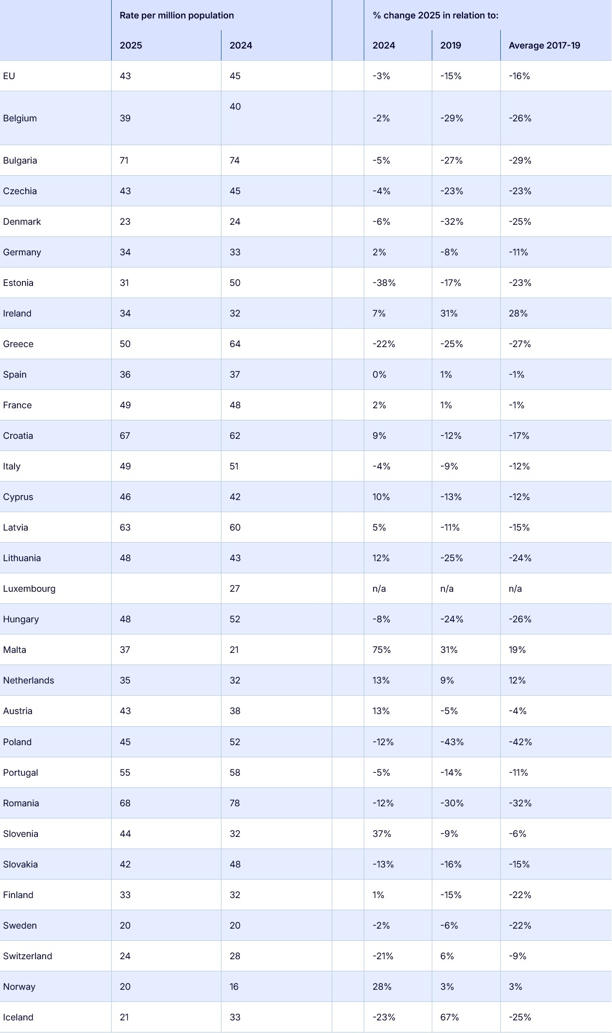 Παρά την πρόοδο αυτή, η Ρουμανία εξακολουθεί να έχει ένα από τα υψηλότερα ποσοστά θνησιμότητας στην ΕΕ μαζί με τη Βουλγαρία και την Κροατία. Η Σουηδία και η Δανία είχαν τους ασφαλέστερους δρόμους το 2025 όπως και τα προηγούμενα χρόνια, με χαμηλά ποσοστά θνησιμότητας 20 και 23 θανάτων ανά εκατομμύριο κατοίκων, αντίστοιχα.