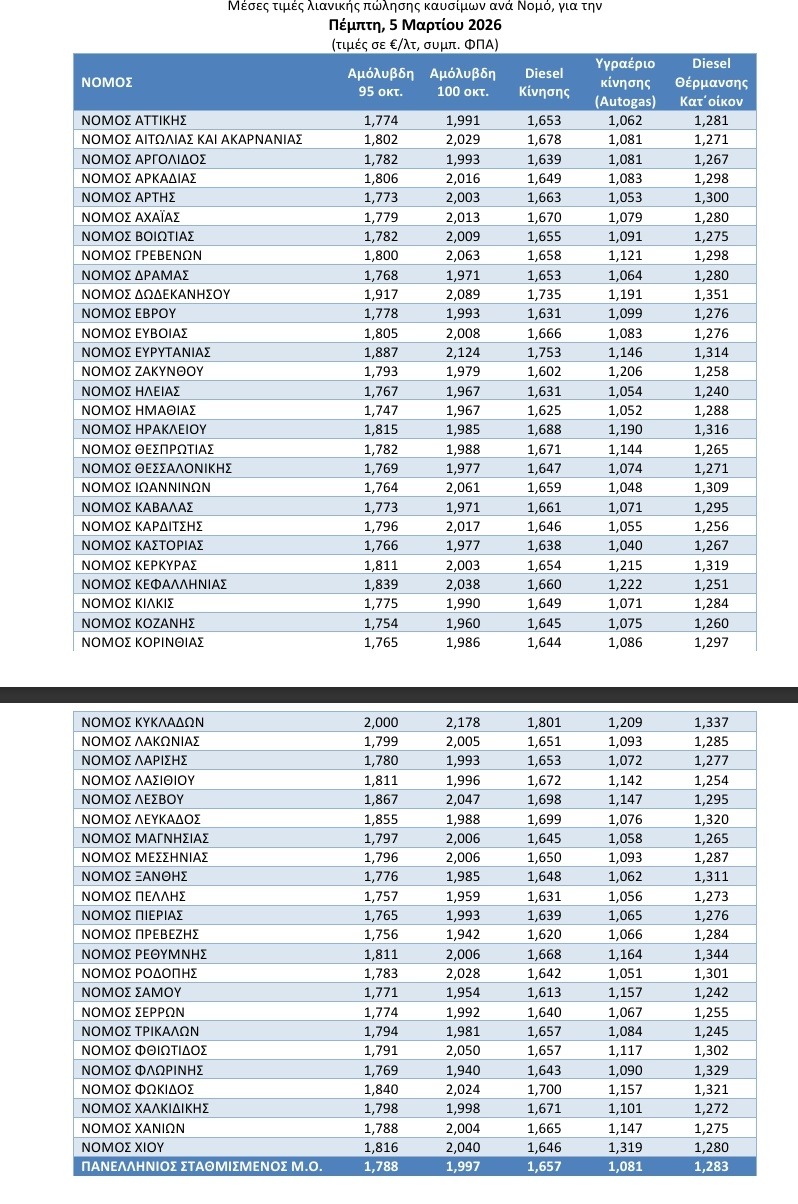 Υπενθυμίζουμε ότι ένα μήνα πριν, στις 30 Ιανουαρίου του 2026, η μέση τιμή της αμόλυβδης βενζίνης στην Ελλάδα, ήταν 1,724 ευρώ ανά λίτρο.