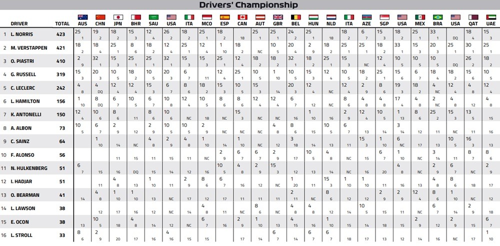 Το Παγκόσμιο Πρωτάθλημα της Φόρμουλα 1 για το 2025 ολοκληρώθηκε στο Άμπου Ντάμπι, με τον Lando Norris να κατακτά το τίτλο. Για να εξασφαλίσει το πρωτάθλημα, ο Norris χρειαζόταν να τερματίσει τουλάχιστον στην τρίτη θέση. Στον αγώνα στον οποίο τελικά επικράτησε ο Verstappen, εκκίνησε δεύτερος, υποχώρησε στην τρίτη θέση και διατήρησε αυτήν τη θέση έως το πέσιμο της καρό σημαίας, εξασφαλίζοντας τον πρώτο τίτλο της καριέρας του.